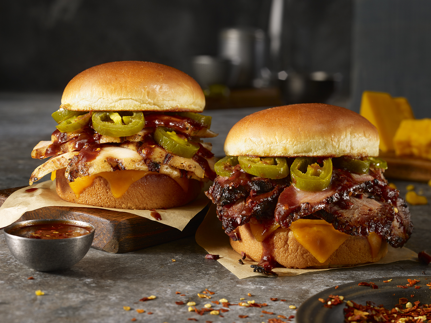 - Spicy Chicken Sandwich ($8) – Slow-smoked marinated chicken breast under a slice of melty Tillamook cheddar cheese, topped with jalapeños and spicy barbecue sauce.