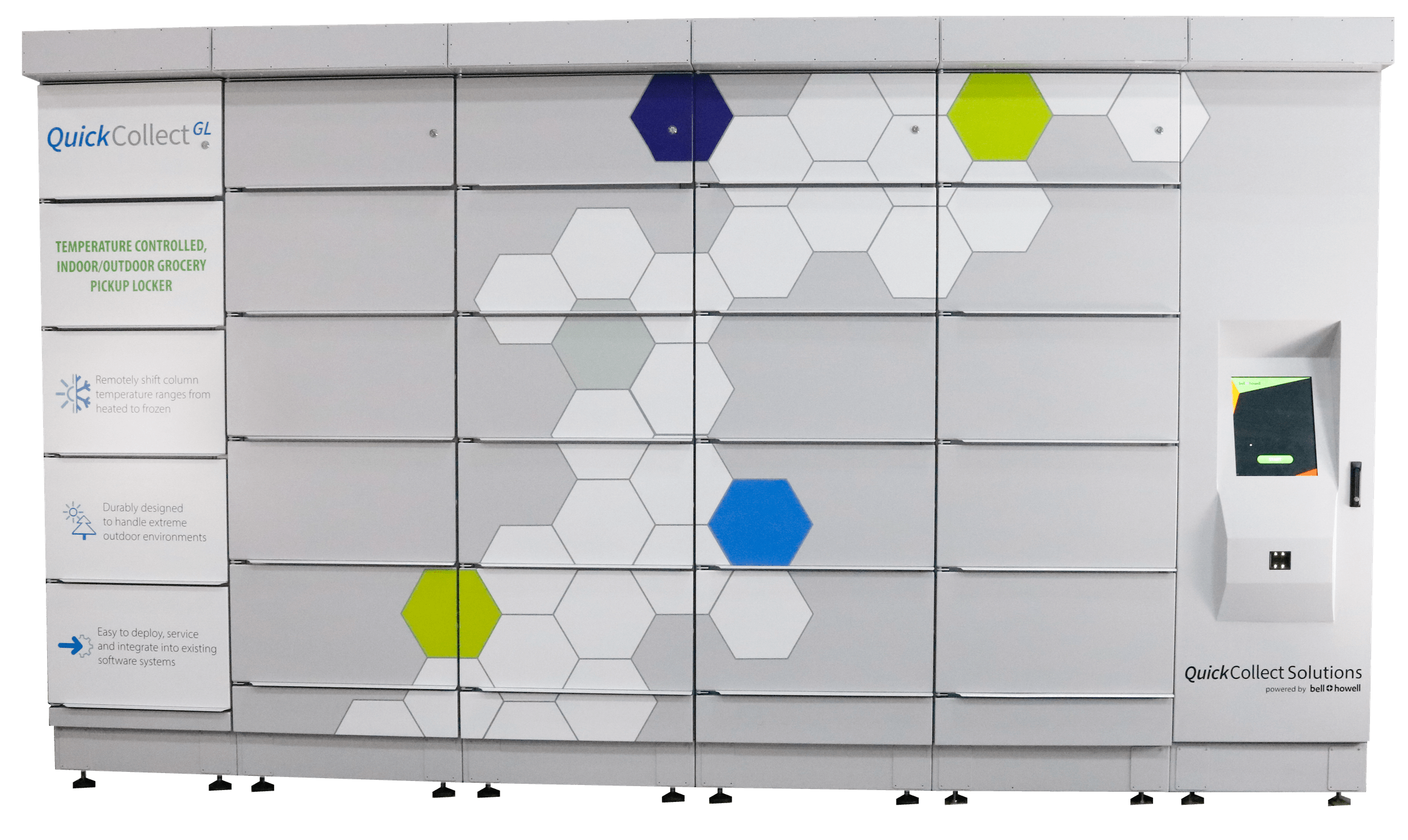 The QuickCollect GL, a member of the QuickCollect Solutions portfolio of automated pickup solutions offered by Bell and Howell, is a modular, temperature-controlled locker engineered for indoor and outdoor installations. Each column in the modular design can be remotely adjusted to be any temperature, from frozen to heated, to meet any specific storage temperature requirements. The lockers will first be available in select locations in the Muncie, IN area, with rapid expansion plans in the works.
