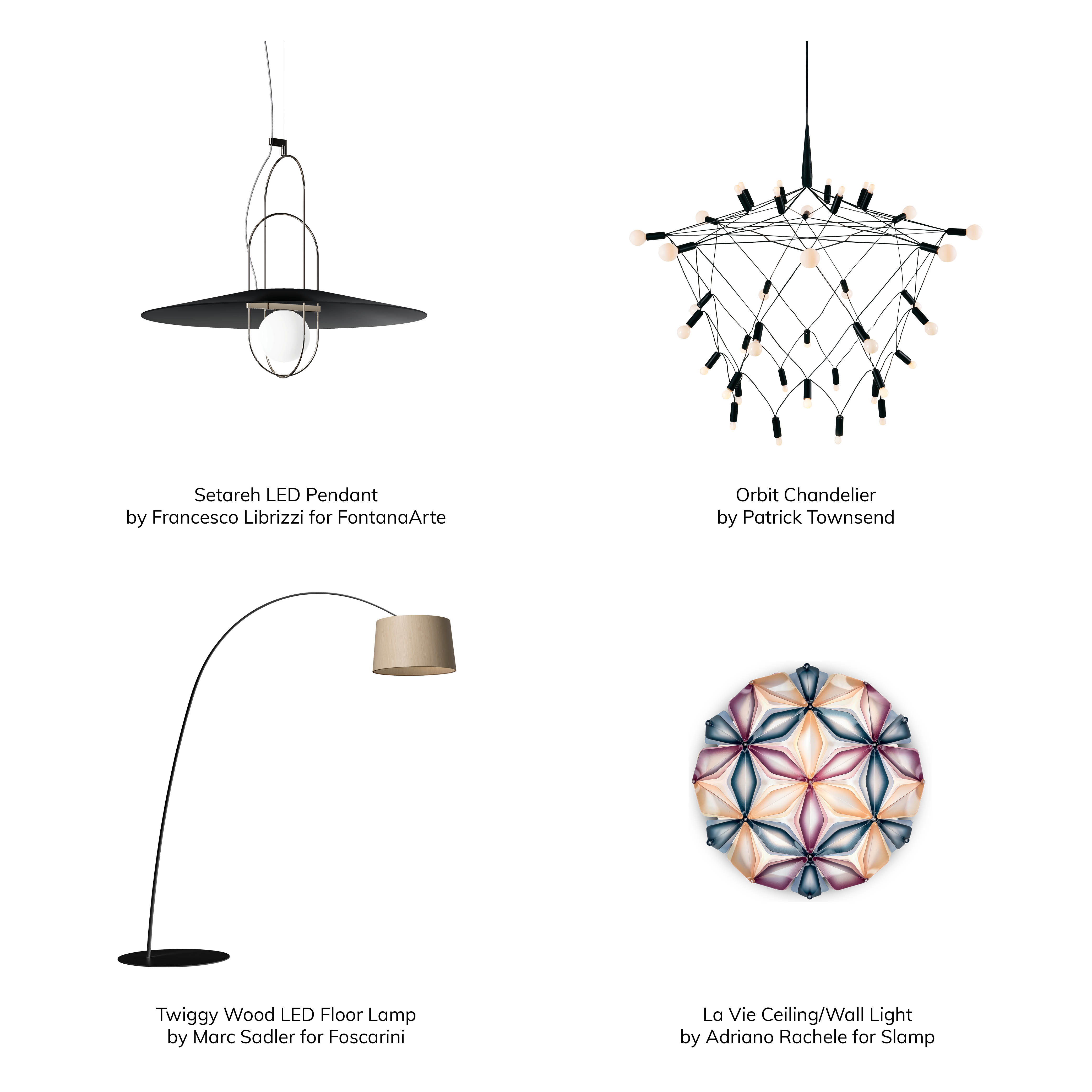 - Orbit Chandelier by Patrick Townsend – Distinguished by its meticulous craftsmanship and extensive range of materials, Patrick Townsend specializes in innovative, often avant-garde pieces that have been seen in retail and commercial spaces, as well as shown in exhibitions throughout the world. The Orbit Chandelier is a regarded signature piece, utilizing tension and compression to create an intricate re-imagining of a classic chandelier, available on Lumens.com and YLighting.com.