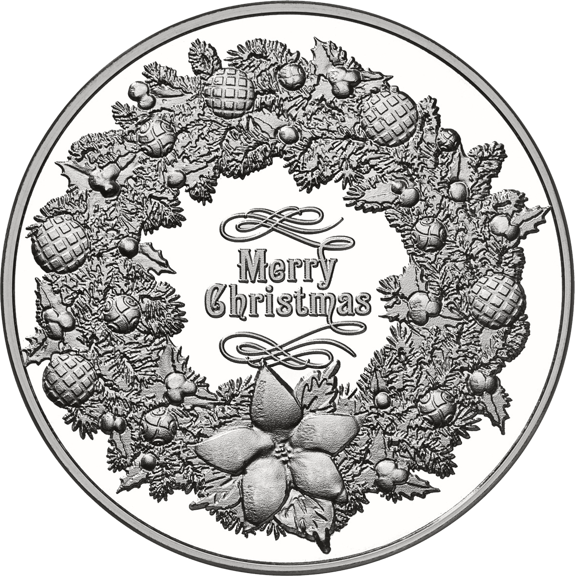 • Wreath – Designed to demonstrate the bounty of the holiday, this collectible silver round features a highly detailed and decorative wreath. This is a true symbol of the Christmas holiday. The wreath is dressed with balsam, holly clusters, ornaments, and a giant poinsettia right at the bottom center. The silver round lends itself perfectly to host the circular nature of the wreath and partnered with the words Merry Christmas truly emulates the season.