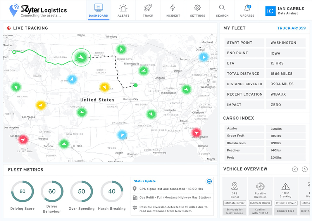 Zyter Smart Logistics connects disparate data systems, departments, and people to give logistics teams end-to-end, real-time visibility of vehicles and goods in transit while also using sensors and mobile applications to collect analytics on driver behavior, such as hard braking and other driving habits. An enterprise user dashboard displays real-time alerts and notifications of any unexpected issues along the route, such as a vehicle breakdown or accident, as well as temperature changes in vehicles hauling perishable goods. As a result, logistics teams can make faster and more intelligent decisions to resolve in-transit issues and keep shipments safe and on track for delivery.